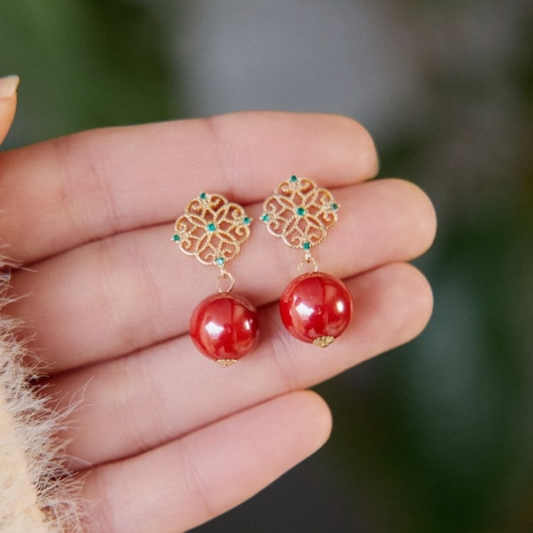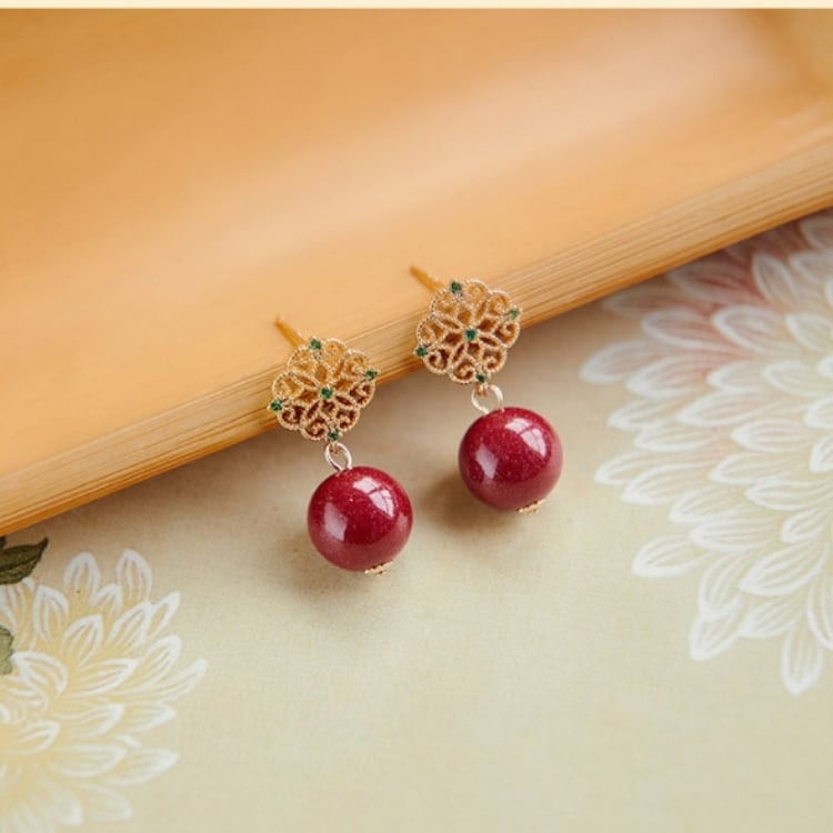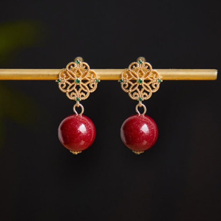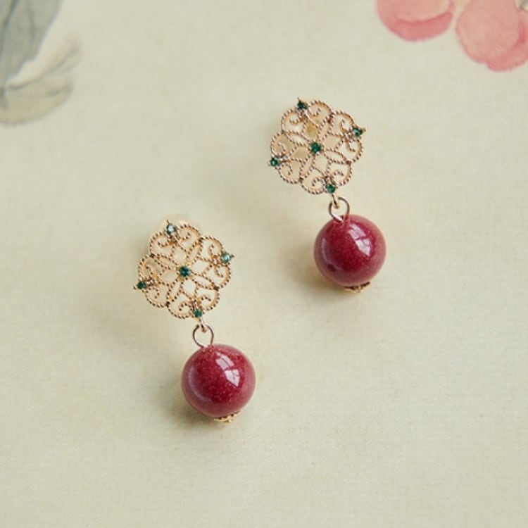 繊細な金細工モチーフに、深みのある朱砂の赤玉を合わせたピアス。