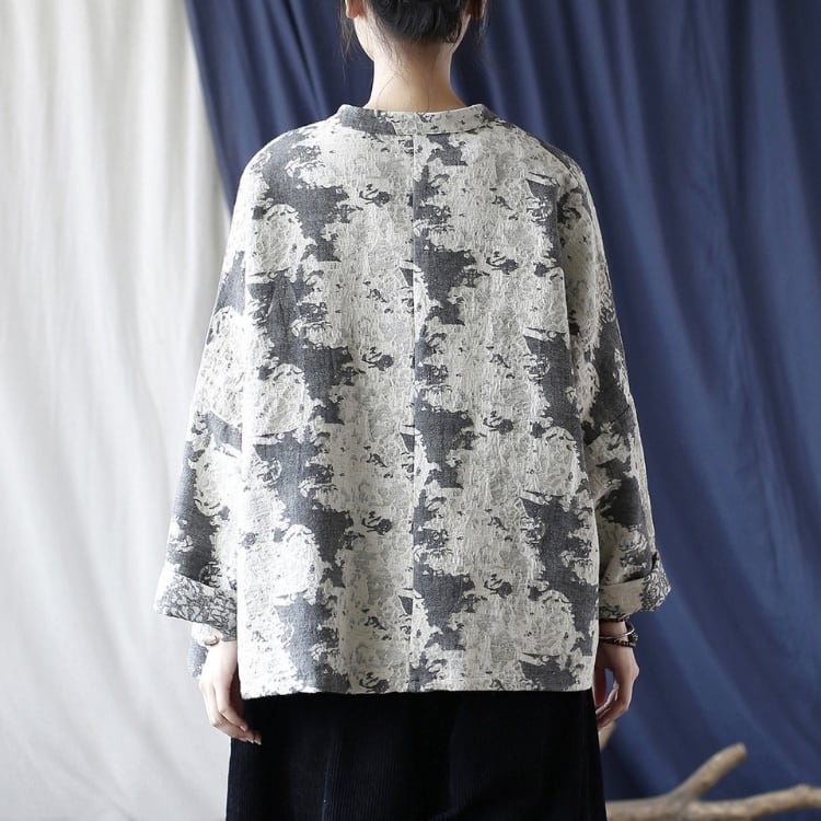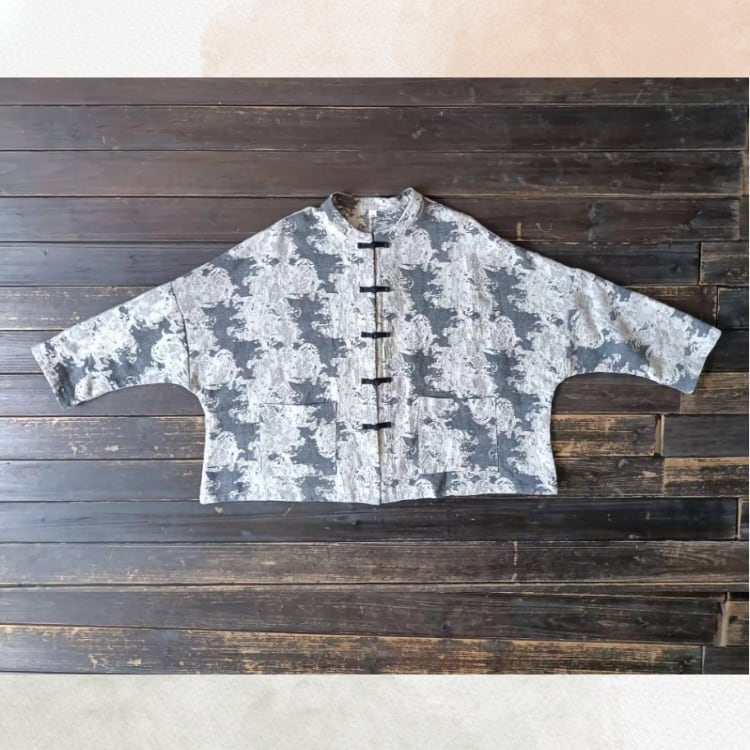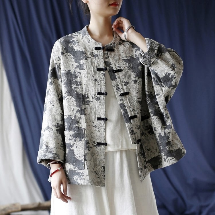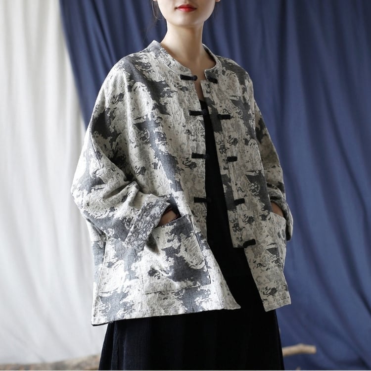 水墨画のような濃淡を映した生地に、チャイナボタンを配したジャケット。