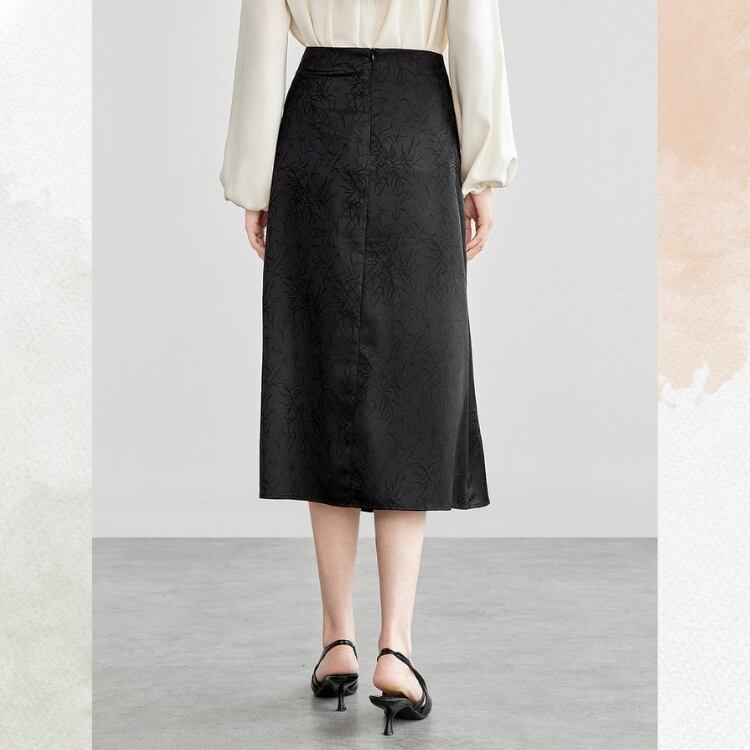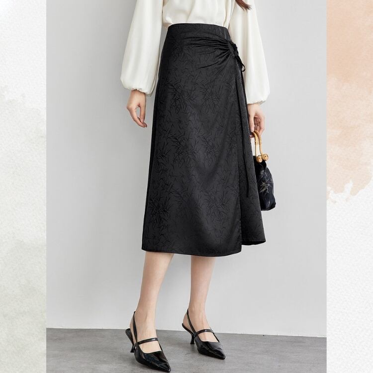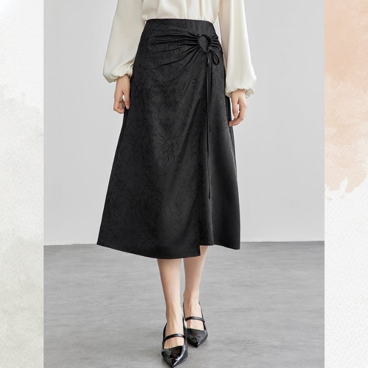 繊細な文様が浮かぶ生地で仕立てた、ラップデザインのスカート。