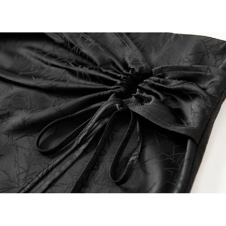 サイドの寄せと結びのディテールが、装いにやわらかな動きを添えます。