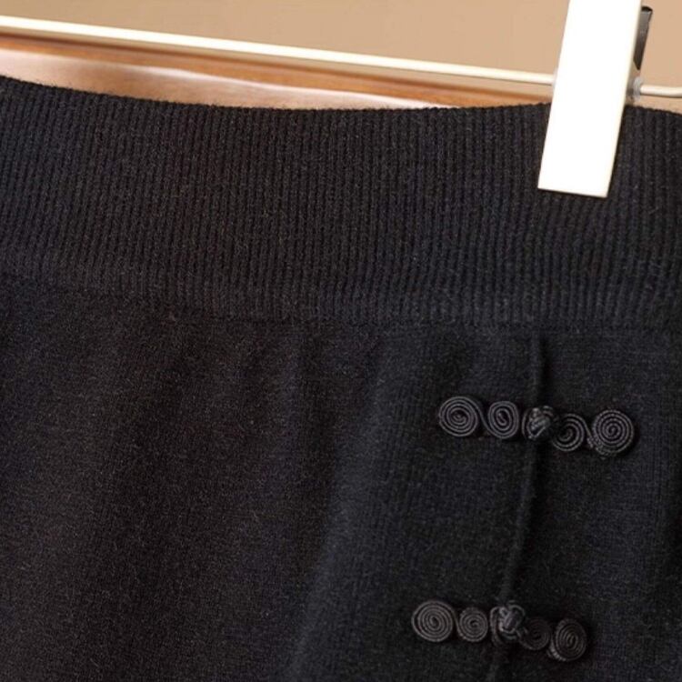 縦ラインに並んだチャイナボタン風の飾りが、シンプルなニットスカートのさりげないアクセントに。
