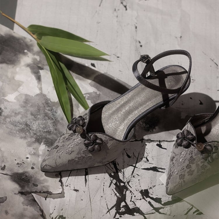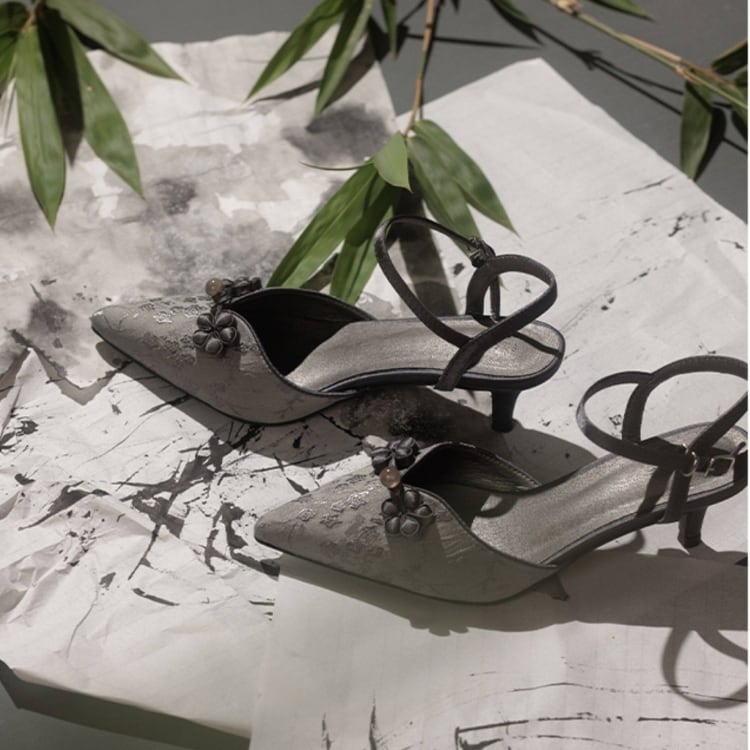 梅の花をかたどった飾りをあしらった、上品なチャイナテイストのパンプス。