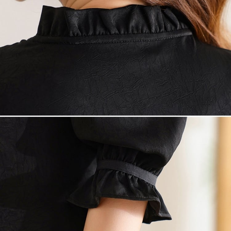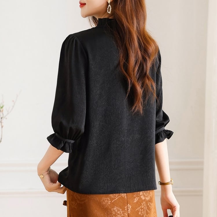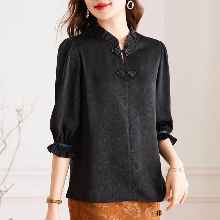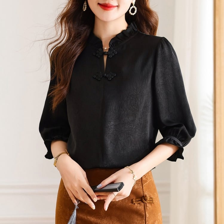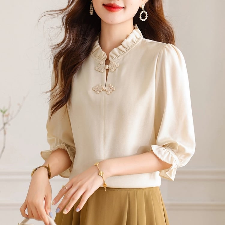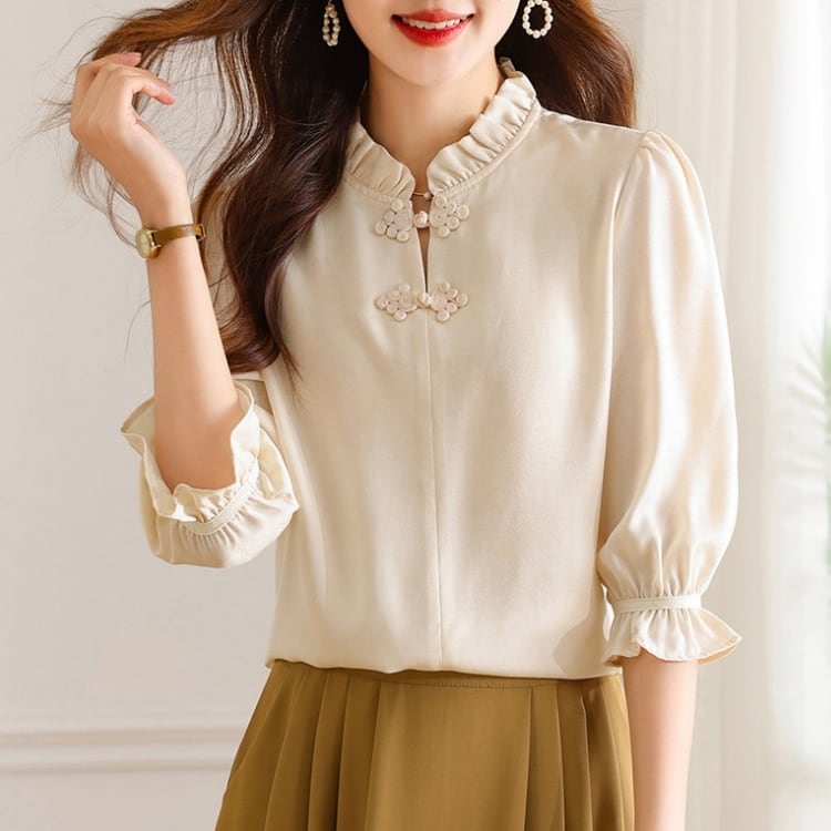 フリル襟とチャイナボタンが印象的な、上品なブラウス。