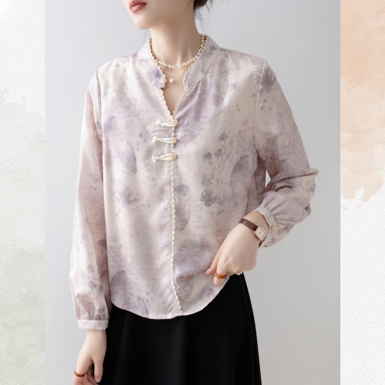 やわらかな水彩タッチの花柄が印象的な、上品なチャイナボタンブラウス。